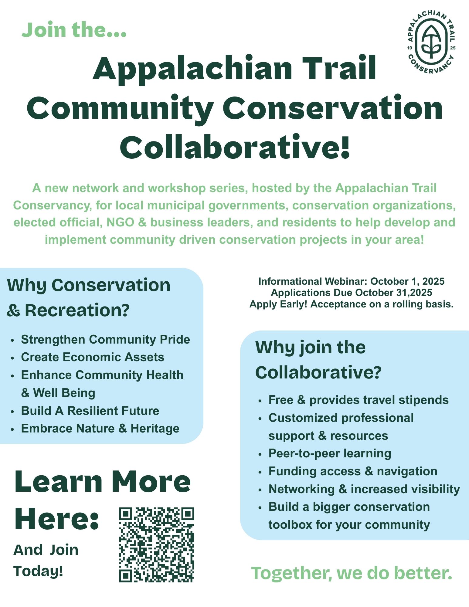 There is no cost to participate in the ATCCC. Eligible communities must be within the Appalachian Trail Landscape in Pennsylvania and meeting team representation and commitment requirements. For community-based teams interested in joining the ATCCC, the ATC will host informational webinars on October 1 and 15 to answer questions about the Collaborative and help communities apply. Visit www.tinyurl.com/atccollab to learn more.