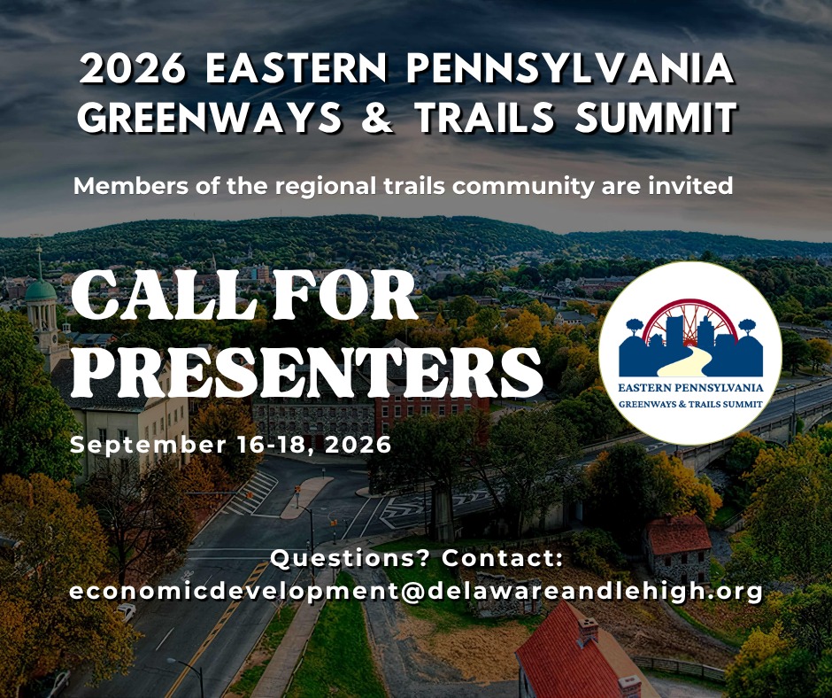 The planning committee for the 2026 Eastern PA Greenways & Trails Summit has opened its call for presentation proposals for this year’s event, to be hosted Sept. 16–18 in Bethlehem. Members of the regional trails community are invited to contribute to three days of speakers, breakout sessions and discussions on leading topics in greenways and trail development.