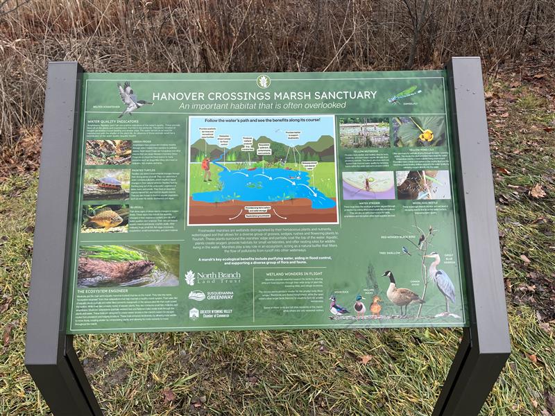 North Branch Land Trust, a regional nonprofit dedicated to land conservation and environmental education, has unveiled a new contextual, interpretive sign at its public nature preserve, Hanover Crossings Marsh. The sign was designed inhouse by the organization’s Marketing Manager, Brittany Lynn, and Environmental Education Coordinator, Leah Malarkey, and serves as an engaging educational resource for visitors of all ages.