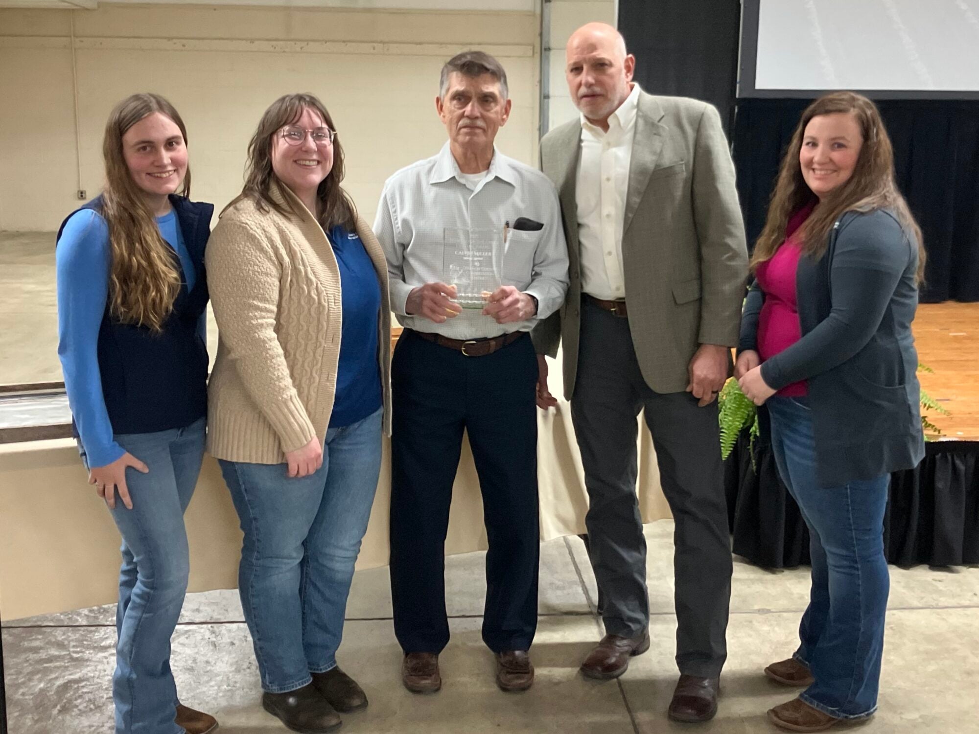 Calvin Miller, center, receives the Steward of the Land Lifetime Award during the inaugural banquet to honor conservation and farmland preservation efforts in Lebanon County by the Lebanon County Conservation District. Pictured with Miller are, from left, LCCD staff members Klarissa Long and Hannah Hartman, board member James Tomanelli, and Maranda Smith, staff. (LebTown file photo)
