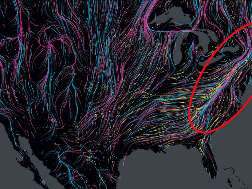 Important Migration Corridor | Scientists have identified the unbroken Appalachian corridor as a globally significant landscape that is crucial to the future of hundreds of mammal and bird species amid a changing climate. This map shows mammal paths in pink, birds in blue, and amphibians in yellow. The Appalachians are circled in red. © Dan Majka/The Nature Conservancy