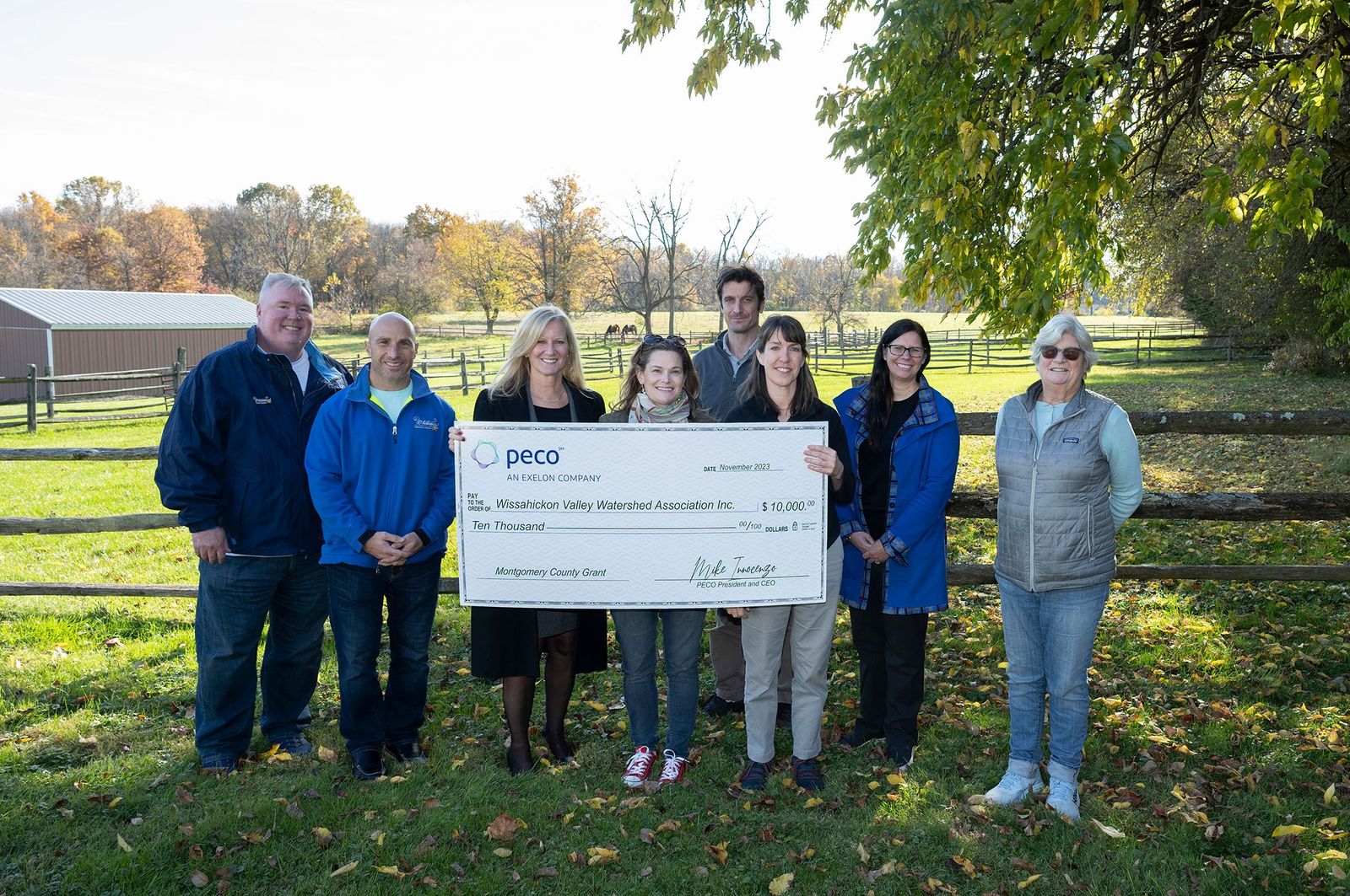 Conservation partners gathered at Willow Lake Farm from left to right: Tom Blomstrom (Director of Parks and Recreation, Whitemarsh Township), Fran McCusker (Chair of the Whitemarsh Township Board of Supervisors), Suzanne Ryan (Regional External Affairs Manager, PECO), Joyce Keller (Whitpain Township Board of Supervisors), John Ferro (Conservation Director, Wissahickon Trails), Gail Farmer (Executive Director, Wissahickon Trails), Kristen Haugen (Board Chair, Wissahickon Trails), Ellen Lea